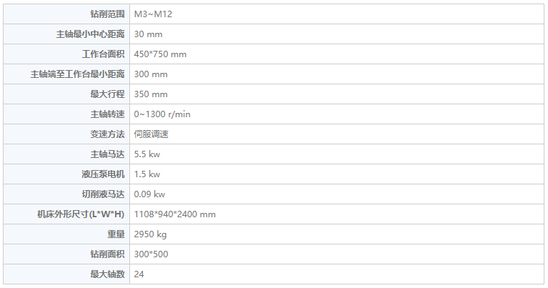 3)孔與孔之間的中心距可以在30~500mm之間任意調整。鉆床的主軸位置在300*500mm面積內任意調整。